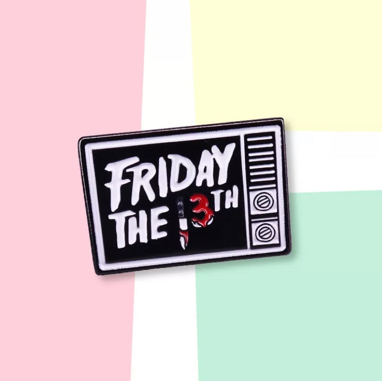 世界一有名なスラッシャー映画『13日の金曜日』のテレビ画面モチーフピンバッジです。